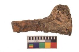 | Description / विवरण | Specimen having rounded body with one flattened end and thickly corroded surface. |
