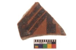 | Description / विवरण | Specimen of black on red ware with decorative geometric Three sets of two oblique bands in opposite direction painting. |