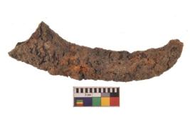 | Description / विवरण | Specimen with curved flat body having uniform thickness with one conical end and thickly corroded surface. |