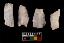| Description / विवरण | There are n 4 flake cores. All of them are fully fluted flake cores without any trace of crested ridge flakes. Some are tapering at one end and some have sharp edges. |