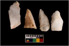 | Description / विवरण | There are n 4 flake cores. All of them are fully fluted flake cores without any trace of crested ridge flakes. Some are tapering at one end and some have sharp edges. |