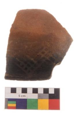 | Description / विवरण | Specimen of black on red ware with decorative geometric Vertical rows of connected latticed diamonds painting. |