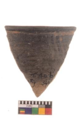 | Description / विवरण | Specimen of black on black ware with decorative geometric Vertical strokes set in two horizontal bands painting. |