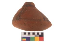 | Description / विवरण | Specimen of a potsherd of black on red ware with traces of decorative geometric Three vertical lines painting. |