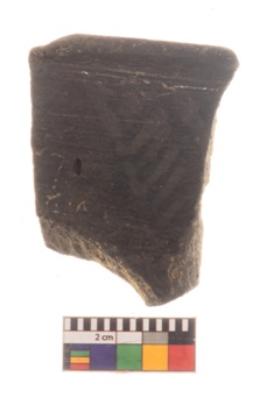 | Description / विवरण | Specimen of black on black ware with decorative geometric Lines slanting to right with strokes at right angles painting. |