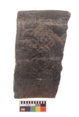 | Description / विवरण | Specimen of black on red ware with decorative geometric Vertical rows of connected latticed diamonds painting. |