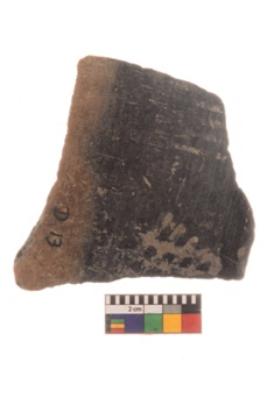 | Description / विवरण | Specimen of black on red ware with traces of decorative geometric Vertical rows of connected latticed diamonds painting. |