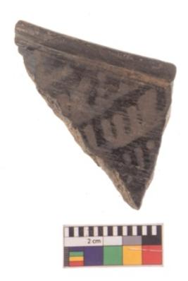 | Description / विवरण | Specimen of black on red ware with decorative geometric Strokes at right angle to left painting. |