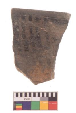 | Description / विवरण | Specimen of black on red ware with traces of decorative geometric outcurved lines painting. |