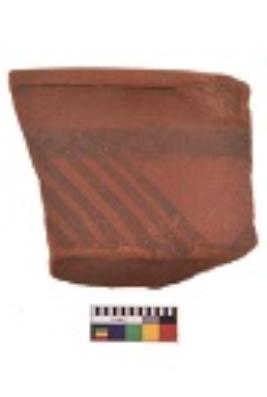 | Description / विवरण | Specimen of black on red ware with decorative geometric Groups of oblique strokes set in horizontal bands on the exterior painting. |