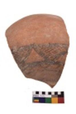 | Description / विवरण | Specimen of black on red ware with decorative geometric A row of latticed dimonds set in horizontal bands but having groups of oblique lines at interval. painting. |