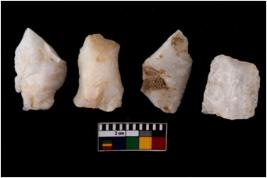 | Description / विवरण | There are n 4 flake cores. All of them are fully fluted flake cores without any trace of crested ridge flakes. Some are tapering at one end and some have sharp edges. |