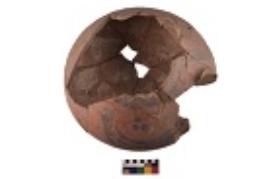 | Description / विवरण | Specimen of black on red ware with decorative geometric Three half circle and three dots painting. |
