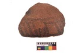 | Description / विवरण | Specimen of black on red ware with decorative geometric Vertical strokes set in two horizontal bands painting. |