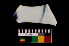 | Description / विवरण | Specimen of potsherd of glazed ware; the surface is highly smooth and glossy. It shows traces of painting in blue. |