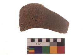 | Description / विवरण | Specimen of pipal leaf disign on exterior of thin coarse Red ware potsherd. |