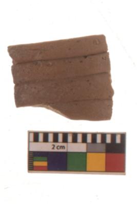 | Description / विवरण | Specimen of horizontal lines on interior of medium coarse Red ware potsherd. |