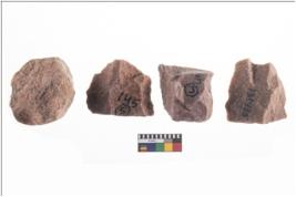 | Description / विवरण | There are n-4 of utilized cores. There are multidirectional irregular dominant scar pattern on both dorsal and ventral face of the cores. Some of them bulge of percussion and some are flat flake cores. |