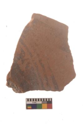 | Description / विवरण | Specimen of Potsherd black on red painted pottery. It is fine fabric in sharp contrast with painted design are executed in black pigment. |