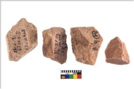 | Description / विवरण | There are n-4 of utilized flake cores. There are multidirectional irregular dominant scar pattern on both dorsal and ventral face of the cores. Some of them bulge of percussion and some are flat flake cores. |
