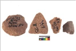 | Description / विवरण | There are n-4 of utilized flake cores. Out of them 3 are made up of Chert and 2 are made up of Quartz. There are multidirectional irregular dominant scar pattern on both dorsal and ventral face of the cores. Some of them bulge of percussion and some are flat flake cores. |