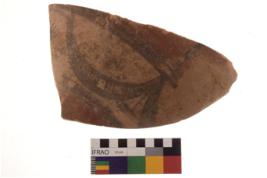 | Description / विवरण | Specimen of Potsherd black on red painted pottery. It is fine fabric in sharp contrast with painted design are executed in black pigment. |