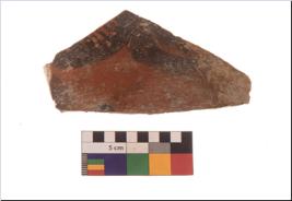 | Description / विवरण | Specimen of pipal leaf disign on exterior of thin coarse Red ware potsherd. |