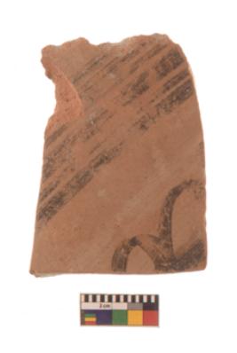 | Description / विवरण | Specimen of Potsherd black on red painted pottery. It is fine fabric in sharp contrast with painted design are executed in black pigment. |