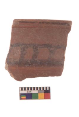 | Description / विवरण | Specimen of Potsherd black on red painted pottery. It is fine fabric in sharp contrast with painted design are executed in black pigment. |