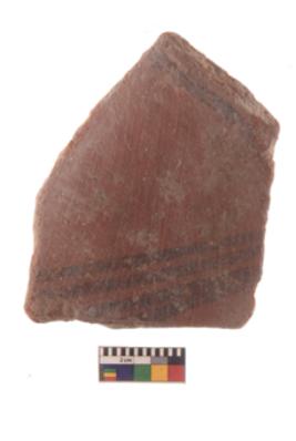 | Description / विवरण | Specimen of Potsherd black on red painted pottery. It is fine fabric in sharp contrast with painted design are executed in black pigment. |