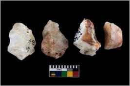 | Description / विवरण | These are n 4 of worked tools. They are tapering at one end and have sharp edges. They have round base and show dominant irregular scar pattern. |