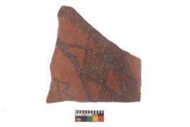 | Description / विवरण | Specimen of Potsherd with black decorative geometric diamond set broad horizontal bands painting . |