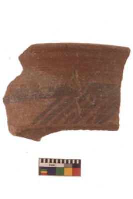 | Description / विवरण | Specimen of Potsherd with black decorative linear painting . |