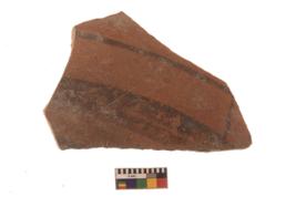 | Description / विवरण | Specimen of Potsherd black on red painted pottery. It is fine fabric in sharp contrast with painted design are executed in black pigment. |