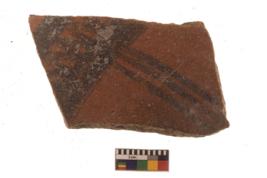 | Description / विवरण | Specimen of Potsherd black on red painted pottery. It is fine fabric in sharp contrast with painted design are executed in black pigment. |