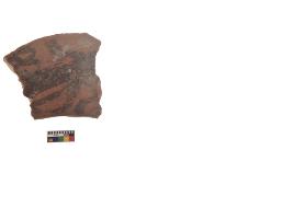 | Description / विवरण | Specimen of black on red ware with black decorative combination of concentric circles divided by a vertical line geometric painting. |