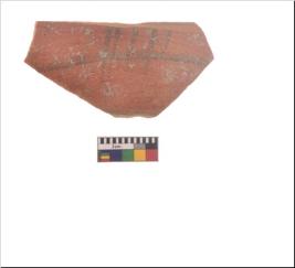| Description / विवरण | Specimen of black on red ware with black decorative Vertical lines on a horizontal line geometric painting. |