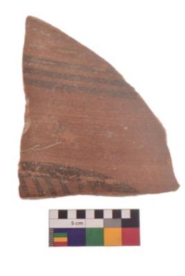 | Description / विवरण | Specimen of black on red ware with black decorative Horizontal lines with a leaf like design on the bottom geometric painting. |