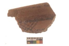 | Description / विवरण | Specimen of potter tool with black decorative geometric Net Pattern painting . |