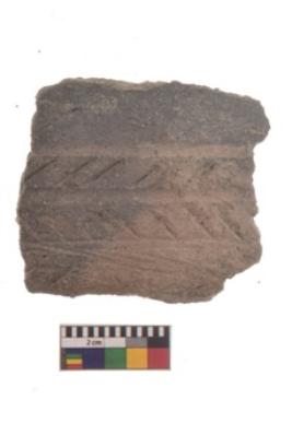 | Description / विवरण | Specimen of black on red ware with black decorative Two bands of diagonal lines geometric painting. |