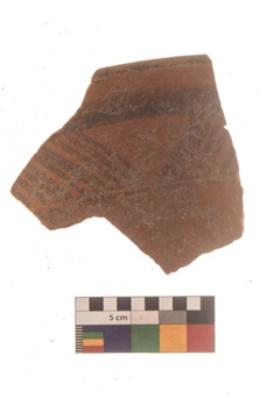| Description / विवरण | Specimen of Potsherd black on red painted pottery. It is fine fabric in sharp contrast with painted design are executed in black pigment. |