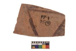 | Description / विवरण | Specimen of black on red ware with black decorative Lines forming a triangle with vertical strokes on the right geometric painting. |