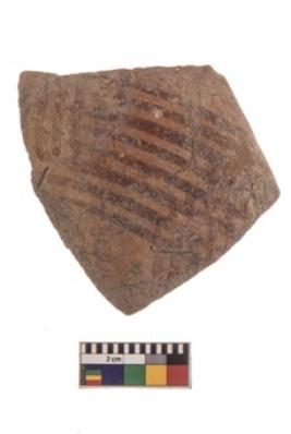 | Description / विवरण | Specimen of black on red ware with black decorative Lattice design geometric painting. |