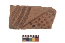 | Description / विवरण | Specimen of black on red ware with black decorative Parallel curved line with a cluster of dots on the right geometric painting. |