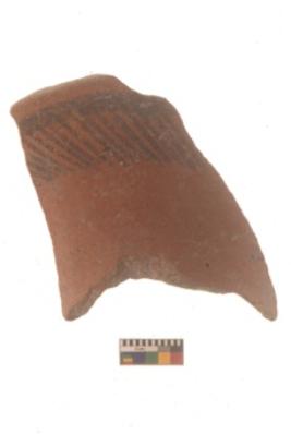 | Description / विवरण | Specimen of Potsherd black on red painted pottery. It is fine fabric in sharp contrast with painted design are executed in black pigment. |