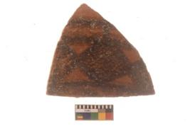 | Description / विवरण | Specimen of Potsherd with black decorative geometric diamond set broad horizontal bands painting . |