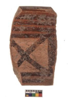 | Description / विवरण | Specimen of black on red ware with black decorative Bands of horizontal lines with intersecting lines in between geometric painting. |