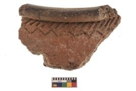| Description / विवरण | Specimen of red on red ware with decorative Slanting strokes with zigzag line below incisions. |