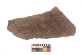 | Description / विवरण | Specimen of Potsherd with black decorative geometric diamond set broad horizontal bands painting . |