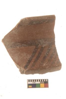 | Description / विवरण | Specimen of Potsherd black on red painted pottery. It is fine fabric in sharp contrast with painted design are executed in black pigment. |